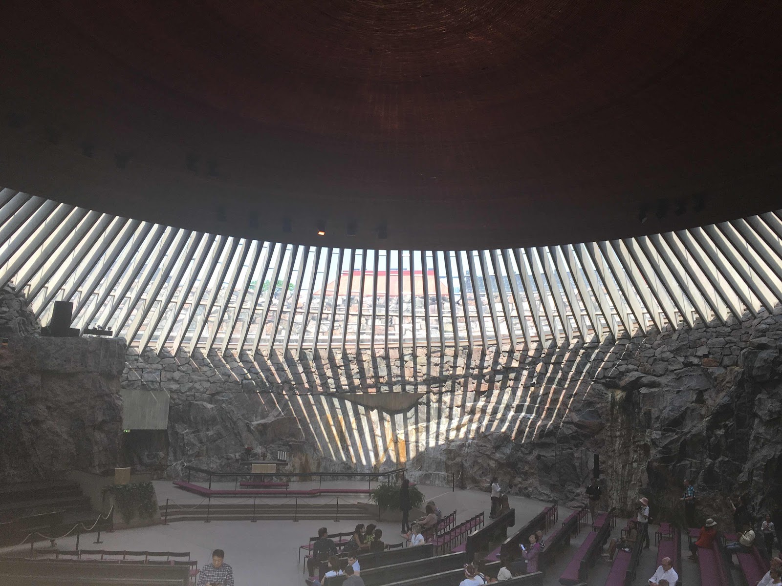 Ich entscheide mich dazu, der Temppeliaukio-Kirche einen Besuch abzustatten und auf diesem Weg kurz bei der Kapelle des Schweigens zu stoppen. Bei dieser Kapelle handelt es sich um einen ziemlich neumodernen und mit Holz verkleideten Bau, welcher für kleine Andachten oder auch Konzerte genutzt wird. Sonntägliche Gottesdienste finden hier aber nicht statt. Nach weiteren zehn Minuten Laufweg, unter anderem am Kiasma Museum für moderne Kunst vorbei, erreiche ich die berühmte Kirche, die in einen Steinhügel hineingebaut wurde. Auch im Inneren des Gebäudes ist der rohe Stein noch überall gegenwärtig und macht den besonderen Charme dieser Kirche aus. Vom Stil her wird sie dem späten Expressionismis zugeordnet und gilt als eines der herausragenden Beispiele finnischer Architektur.